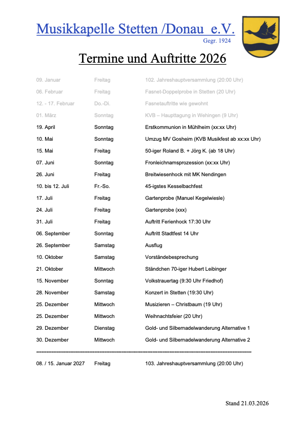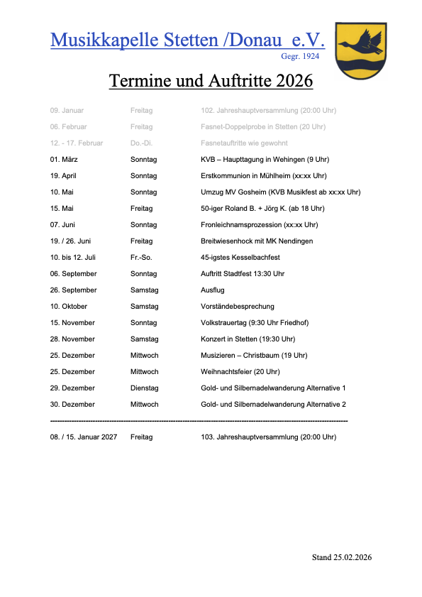 Im folgende Abschnitt sind alle Termine und Auftritte für die aktuelle Saison aufgeführt.
